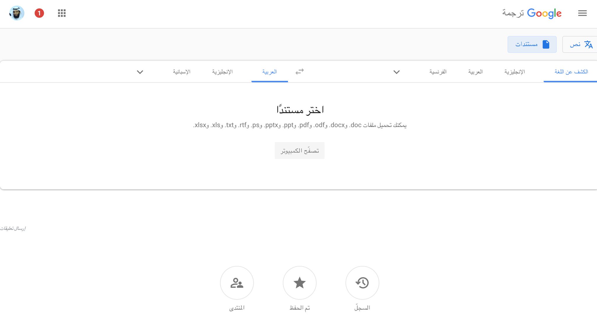 عبدالعزيز الحمادي Di Twitter إذا أردت ترجمة أي ملف لديك وورد Pdf اكسل بوربوينت كتاب إلكتروني وغيرها الكثير من أي لغة إلى العربية في ثواني وبشكل مجاني فـgoogle توفر لك صفحة تدخلها