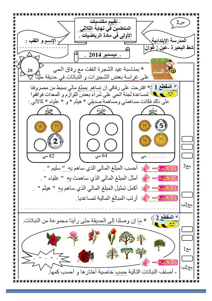 تقييمات رياضيات الثلاثي الثاني السنة الأولى إبتدائي مرحلة ابتدائية موقع قراية