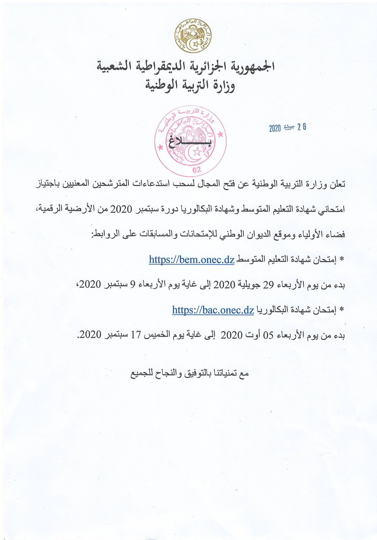 Min Education Dz On Twitter سحب استدعائي امتحاني شهادة التعليم المتوسط وشهادة البكالوريا دورة 2020 Bem 2020 Bac 2020