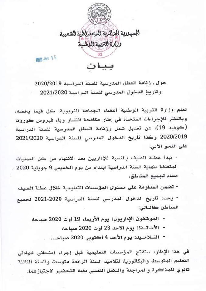 وزارة التربية روزنامة العطل المدرسية للسنة الدراسية 2019 2020 ميديا بلوس تونس