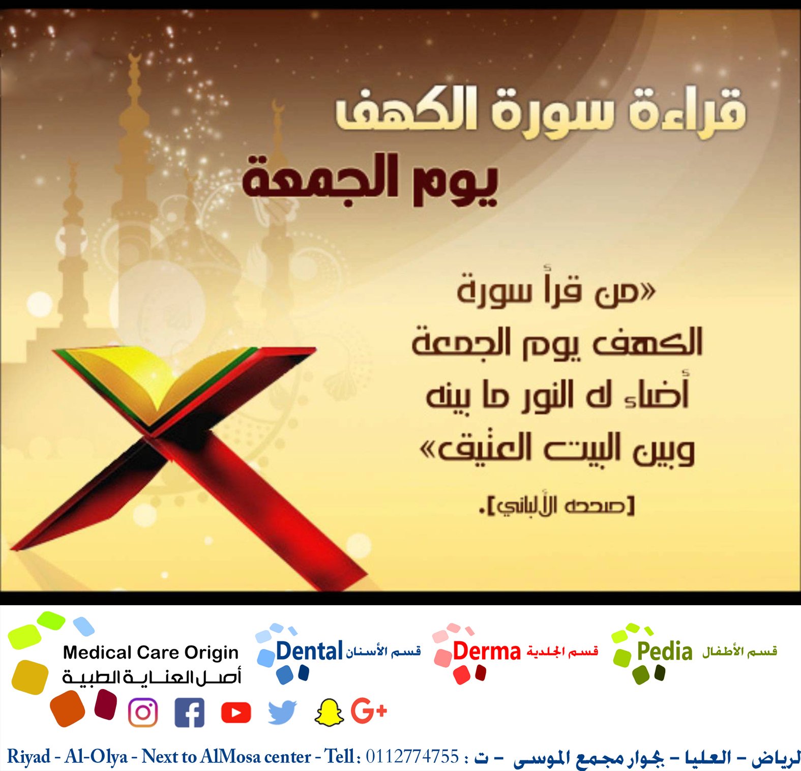 Medical Care Origin على تويتر قراءة سورة الكهف يوم الجمعة قال رسول الله صلى الله عليه وسلم من قرأ سورة الكهف يوم الجمعة أضاء له النور ما بينه وبين البيت العتيق